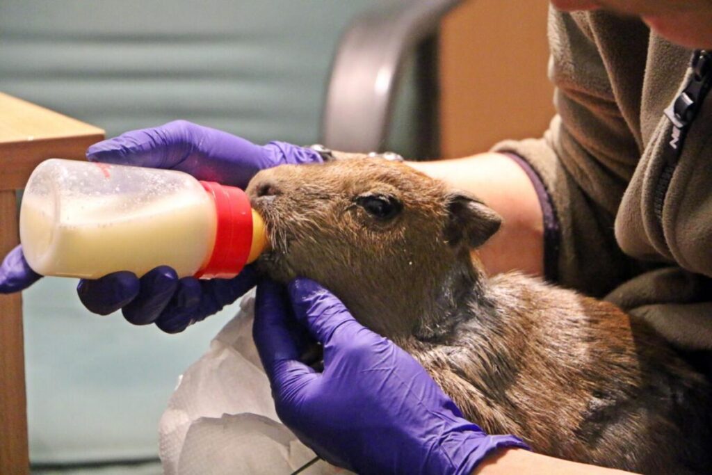 – Przy pierwszych oględzinach miotu zorientowaliśmy się, że jeden z noworodków – samica, został mocno poturbowany przez któregoś z członków rodziny. Natychmiast oddzieliliśmy malucha, który poważnie pogryziony, z licznymi krwiakami potrzebował fachowej pomocy weterynaryjnej i troskliwej ludzkiej mamki. Najtrudniejsze zadanie polegało na dokarmianiu kapibarki, leczeniu jej, ale równocześnie niepozbawianiu stałego kontaktu z rodziną. Po każdej interwencji maluszek oddawany był matce i rodzeństwu. Po kilkunastu dniach po raz pierwszy zaobserwowaliśmy, że samiczka w naturalny sposób pobiera mleko od matki. Była to radosna chwila, na którą czekaliśmy niecierpliwie od początku – mówi Andrzej Gutowski, kierownik hodowlany.